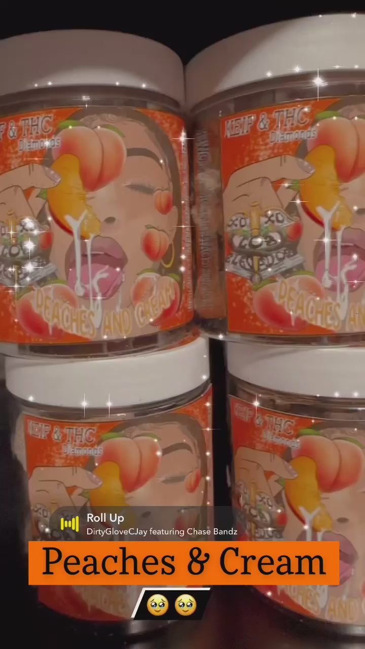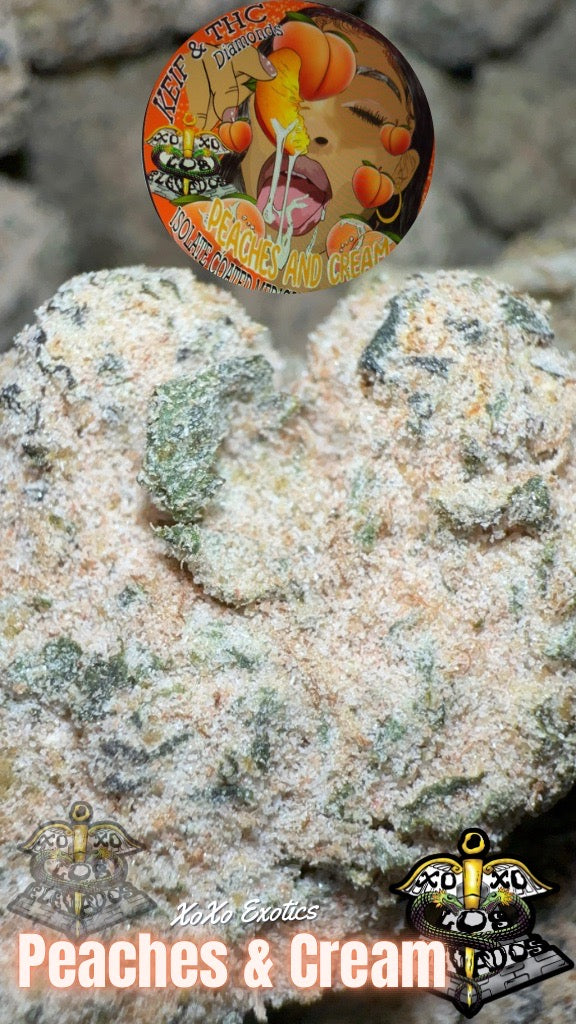 Handcrafted premium indoor grown THC-A flower coated with THC-A isolate, THC-A wax diamonds and THC-A kief. The unique color comes from an all natural blend of peach dry powder, THC-A kief and other proprietary ingredients.